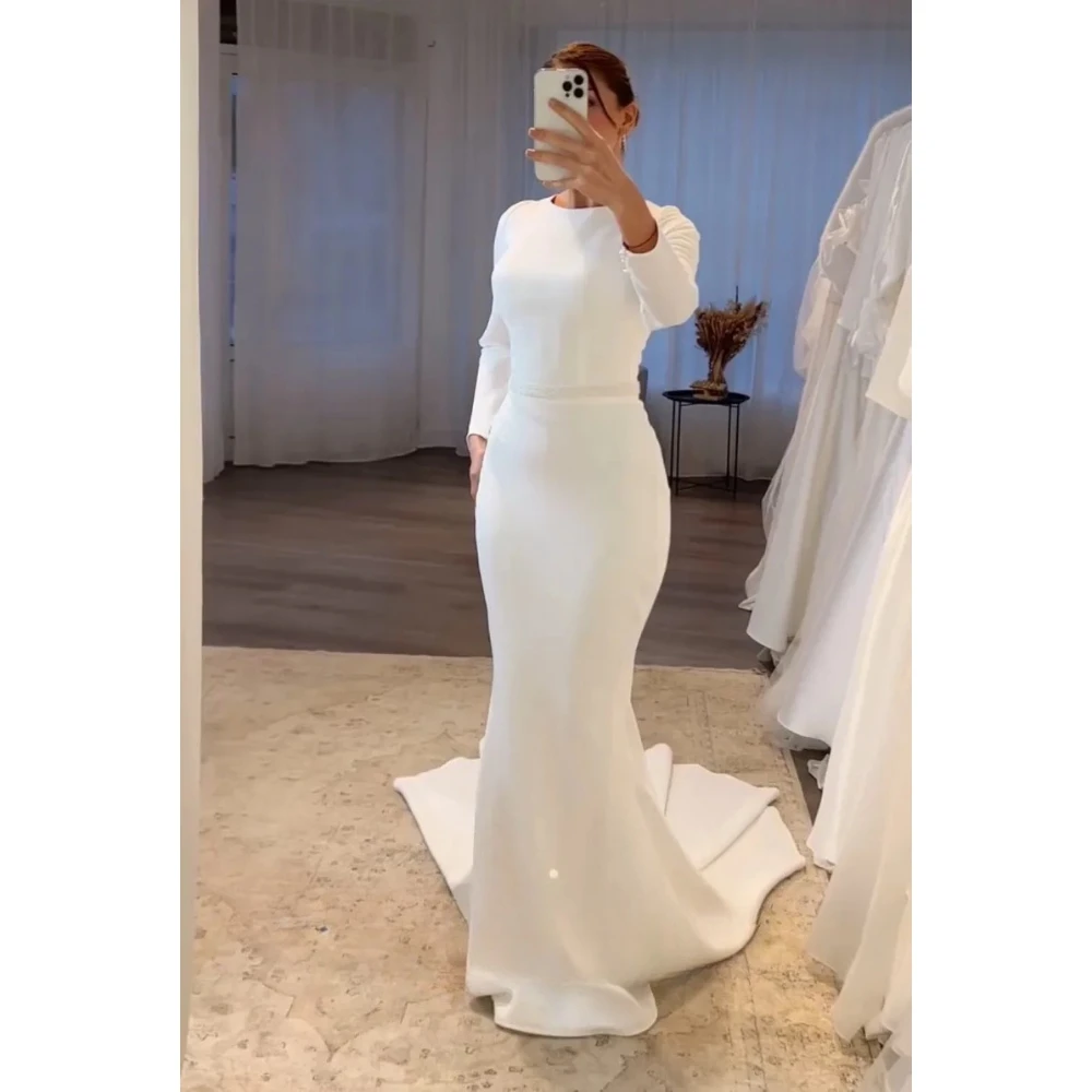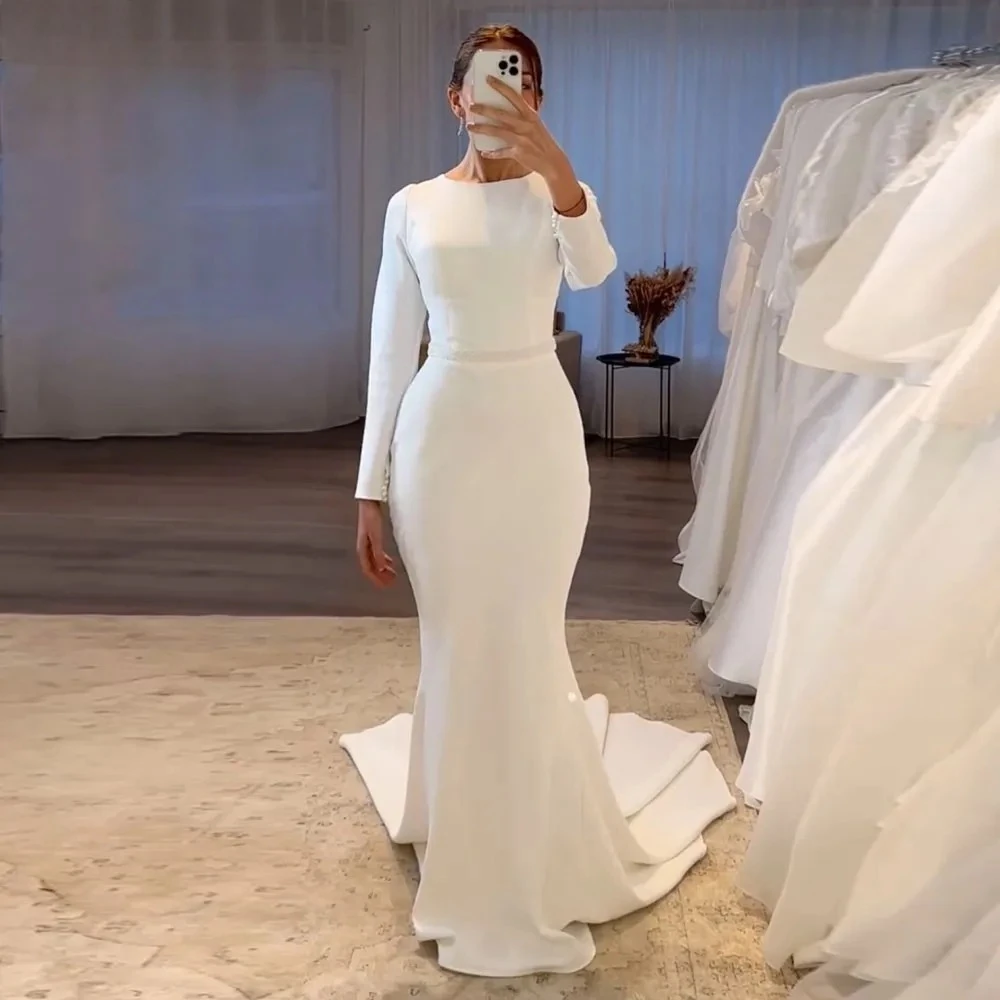Vestido de noiva elegante em corte sereia, com mangas compridas e design minimalista. Perfeito para noivas que procuram um estilo moderno, sofisticado e confortável.